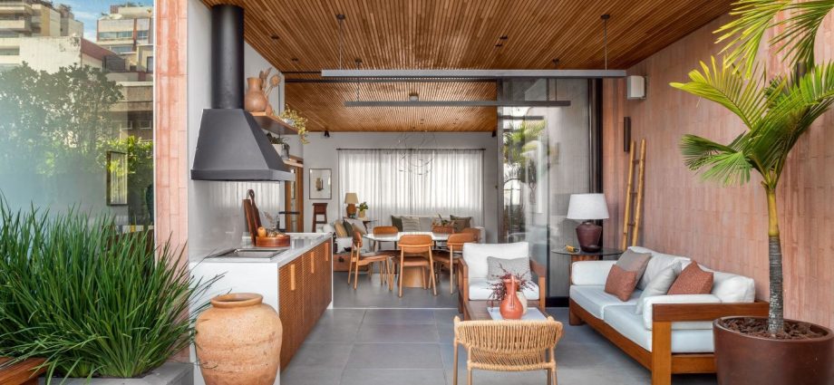 A varanda destaca-se com um armário de madeira freijó e uma churrasqueira, criando um local perfeito para reunir amigos e familiares. A área externa é complementada por um jardim vertical e uma piscina, oferecendo um espaço relaxante em meio à urbanidade. A parede de tijolos aparentes não só embeleza, mas também ajuda a bloquear a visão dos prédios vizinhos, garantindo privacidade.